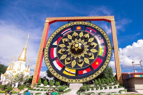 วัดถ้ำคูหาสวรรค์ ตั้งอยู่ใน อำเภอโขงเจียม จังหวัดอุบลราชธานี ซึ่งวัดแห่งนี้ สร้างขึ้นมาประมาณปีพ.ศ. 2521 โดย หลวงปู่คำคะนิง จุลมณี แม้ว่าตอนนี้ท่านจะมรณภาพไปแล้ว แต่ร่างกายไม่เน่าเปื่อย อีกทั้งทางวัดก็ยังคงเก็บรักษาร่างท่านเอาไว้ให้ได้สักการะด้วยเช่นกันค่ะ มาดูไฮไลท์อันโดดเด่นของวัดนี้กันดีกว่า นั่นก็คือ ฆ้องขนาดใหญ่ที่สุดในโลก มีเส้นผ่านศูนย์กลาง 20 เมตร สูงจากพื้น 26 เมตร ตกแต่งด้วยลายกนกทอง และล้อมด้วยธงกลุ่มประเทศอาเซียนอีก