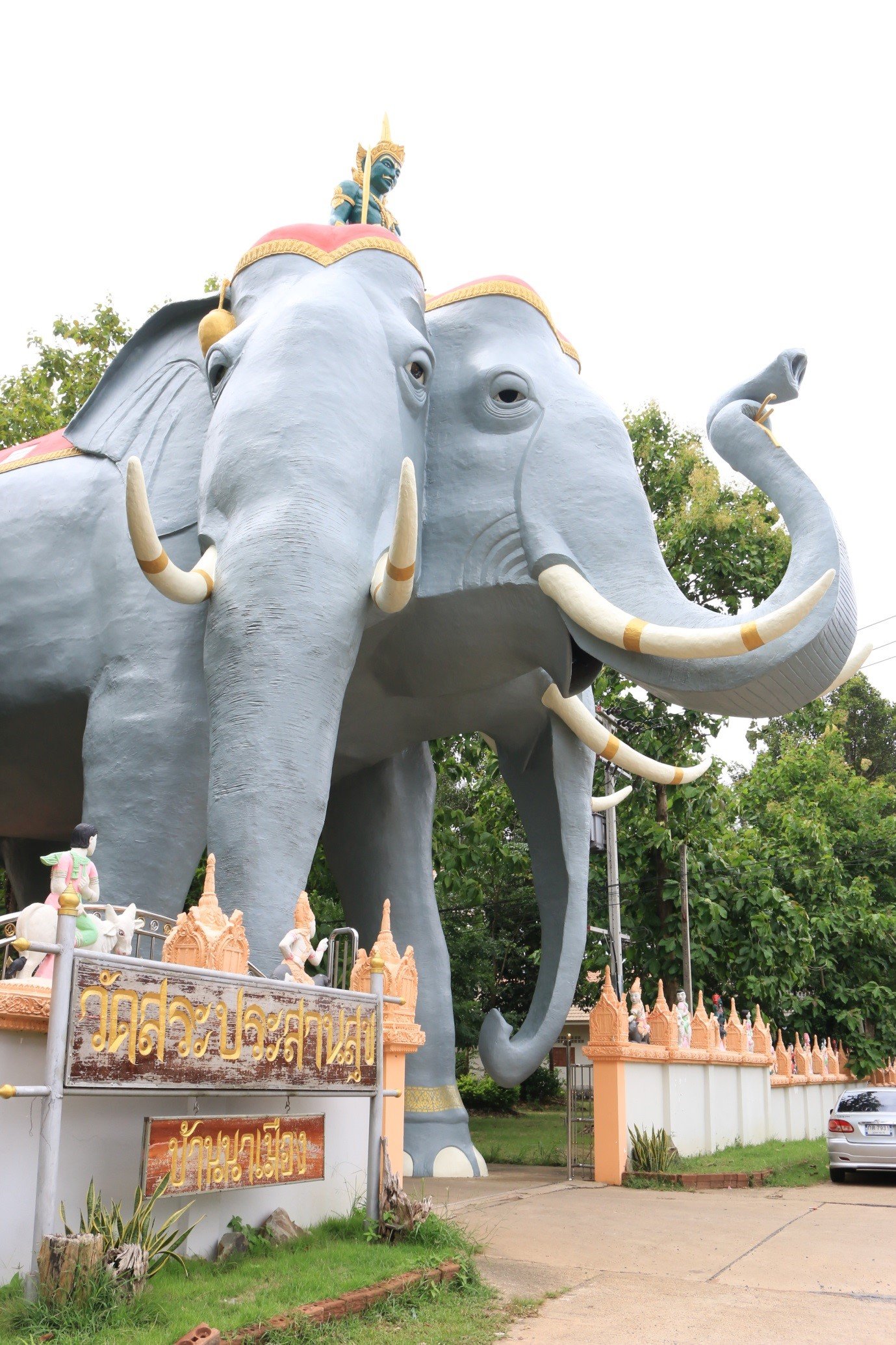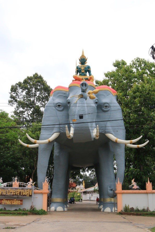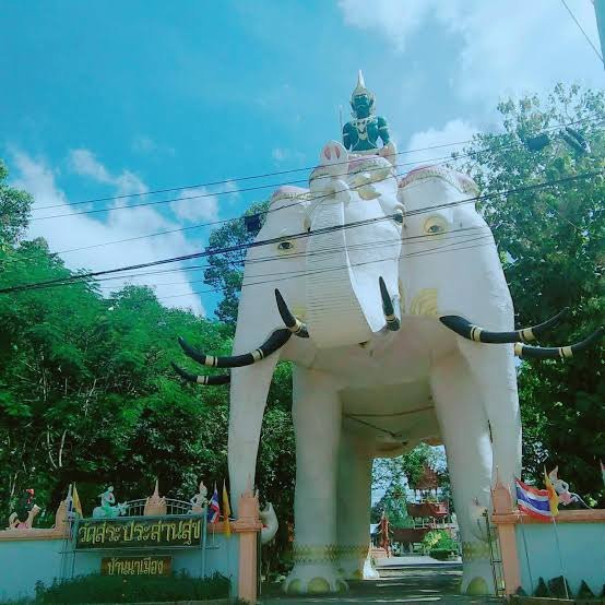 ซุ้มประตูพระอินทร์ทรงช้างเอราวัณ ๓ เศียร จุดเด่นหน้าทางเข้าวัดสระประสานสุขคือซุ้มประตูพระอินทร์ทรงช้างเอราวัณ เป็นความเชื่อในการลอดท้องช้าง เพื่อเป็นศิริมงคลสำหรับผู้ที่ได้ลอดท้องช้าง